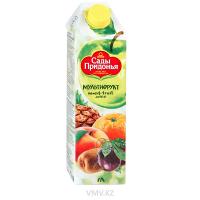 Состав: апельсиновый сок, ананасовый сок, яблочный сок, персиковое пюре, пюре из киви, сок маракуйи. Изготовлен из концентрированных соков и пюре.